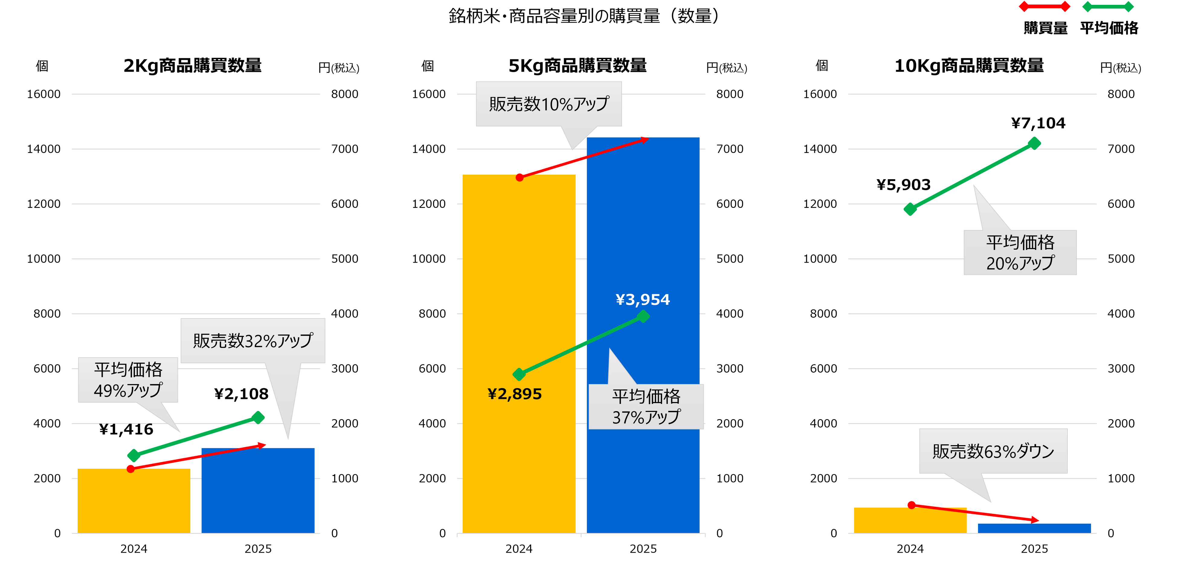 銘柄米の容量別数量では、2kg商品(前年比+32%)と5kg商品(同+10%)が増加する一方、10kg商品は前年比▲63%減となり、“大容量”から“小容量”へとシフトする動きが明確となっています。