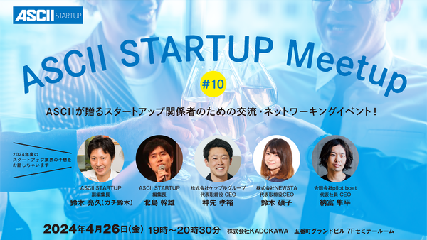株式会社角川アスキー総合研究所(本社:東京都文京区、代表取締役社長:加瀬典子)が運営する「ASCII STARTUP」は、スタートアップやテクノロジー業界の関係者に向けた月例のネットワーキング・交流イベント「ASCII STARTUP Meetup」を開催します。