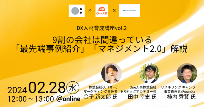 組織の”人”にかかわる業務を一気通貫で支える人材プラットフォームの「One人事」を提供するOne人事株式会社(本社:東京都品川区、代表取締役社長:唐沢 雄三郎)は、リスキリング支援サービス「Reskilling Camp」を提供するパーソルイノベーション株式会社(本社:東京都港区、代表取締役社長:大浦 征也)、1on1ツール「Co:TEAM(コチーム)」を提供する株式会社O:(オー)(本社:東京都杉並区、代表取締役:谷本 潤哉)と共同でWebセミナー『9割の会社は間違っている!?「最先端事例紹介」「マネジメント2.0」解説』を2024年2月28日に開催いたします。