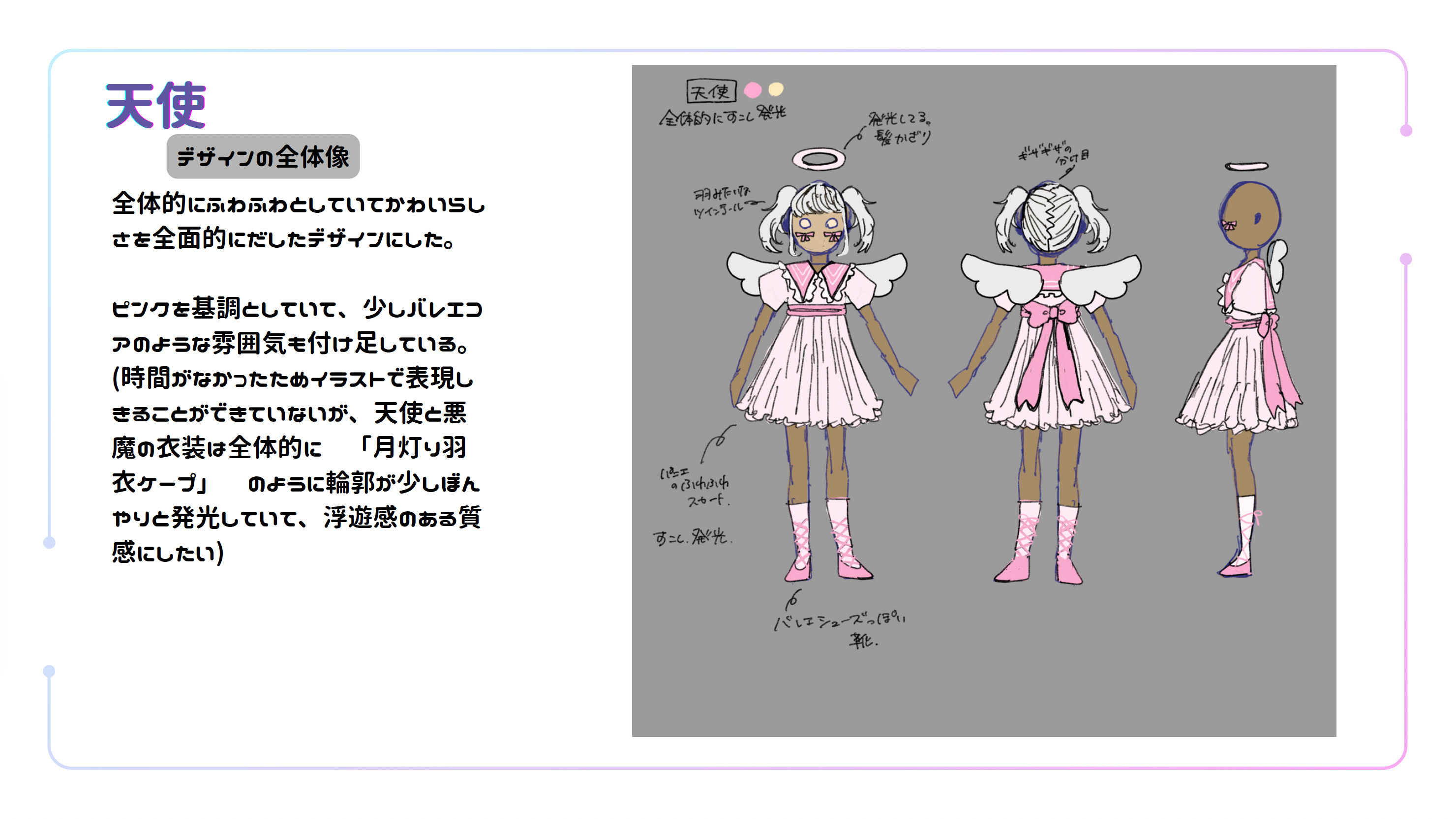 そのテーマを基にしながら、日頃描いているテイストの絵から描き始め、そこからSkyのビジュアルに合うようなアイテムに落とし込んでいった過程を、それぞれのアイテムに込めた想いやイメージした世界観を説明しながら発表しました。