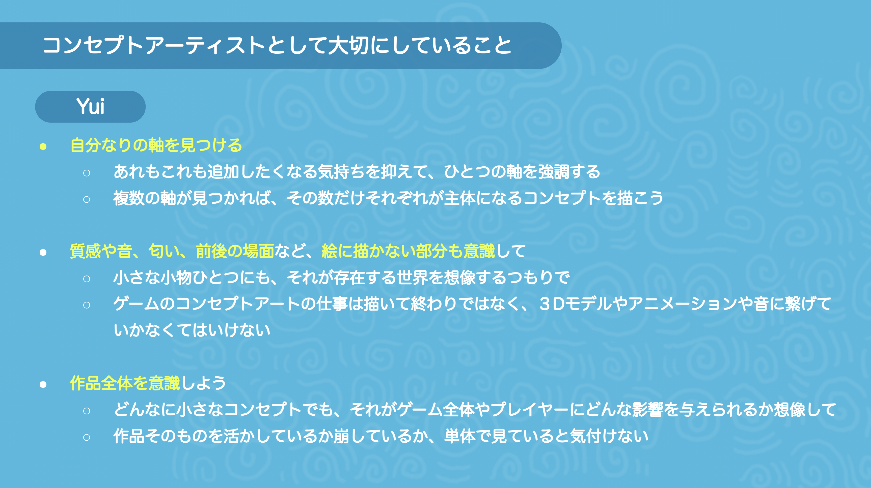 藤原はコンセプトアーティストを「世界観とビジュアルをつくる人」と説明し、ゲーム制作の初期段階において、どのような場所でどのようなキャラクターがどのような物語を生きているのかを可視化し、チーム全体で世界観を共有する役割を担うと述べました。また講義では、田邊がSkyの制作過程で描いた貴重なコンセプトアートも公開され、構想段階の思考や世界観形成のプロセスが示されました。田邊は、コンセプトアーティストに求められるのは単に絵を描くことではなく、作品が示す世界観や意図を言語化し、制作チームに正確に伝えることで実装への近道になると語りました。