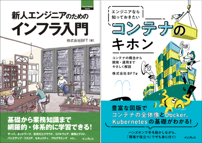 BFTは、「Think IT」 内にて連載した「新人エンジニアのためのインフラ入門」と「エンジニアなら知っておきたいコンテナのキホン」を書籍化、発売しております。