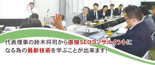 誰もが利用できる日本一のSEOコンサルタント養成機関を目指すために講師であり現役のSEOコンサルタントである鈴木将司が日頃のクライアント企業とのコンサルティング経験から導き出したSEO技術とコンサルティング技術をまとめて独自カリキュラムを作成しました。