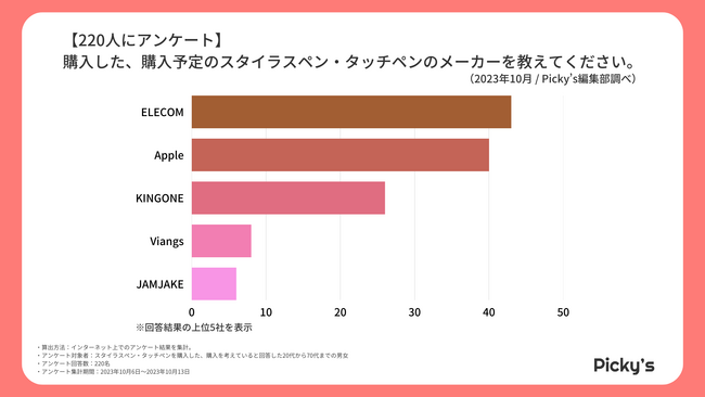 「Picky’s」は、インターネットショッピングにおいて、購入前に試せない・選ぶべきものがわからないという課題の解決を目標に、あらゆる商品のおすすめランキングや検証レビューを紹介するサイトです。このたびPicky’s(https://rentry.jp/note/)では、スタイラスペン・タッチペンについてインターネット上でアンケート調査を行いましたので発表いたします。