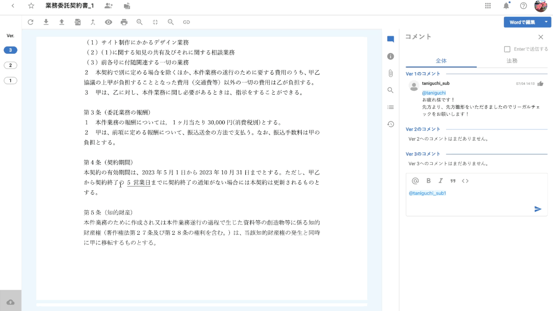 株式会社Hubble(東京都渋谷区、CEO:早川晋平)が提供する契約書管理クラウドサービス「Hubble(ハブル)」は、コメント機能を強化し、契約書の各バージョン全体に対するコメントだけでなく、Hubble上に表示されるWordファイルの内容の個別の条文や文言等を指定してコメントを送信することができる「指定箇所コメント」機能を実装いたしました。今回の機能強化により、Wordのコメント機能だけでは社外向けコメントと社内向けコメントを分けることができない結果、本来社外に見せるべきではない社内向けコメントが相手に共有されてしまうような人為的なミスを防止することが可能になりました。これにより、これまで以上に、Hubbleを通じて、安心して契約書のレビュー業務におけるコミュニケーションを行うことが可能になります。