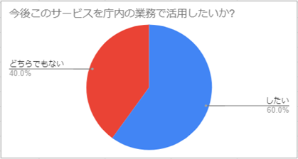 今回の実証実験を通じ、庁内におけるWeb会議の実態を把握することができました。細かな課題はあるものの、多くの職員が手軽にツールを使い、Web会議を行えていることがわかりました。実際、アンケートでは60%が「今後、サービスを庁内の業務で活用したい」と回答しています。
