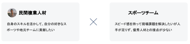 プロスポーツチームは地域に根ざしているため、地方都市では特に人材登用の難しさが存在しています。しかし、「複業」は人材不足を解消するほか、日本のスポーツの発展に寄与することも可能にします。さらに、これまで働く場所や環境でスポーツチームに携わることを諦めていた都心で活躍する人材とのマッチングも創出できるため、相互のスキルシェアによる組織強化も実現します。