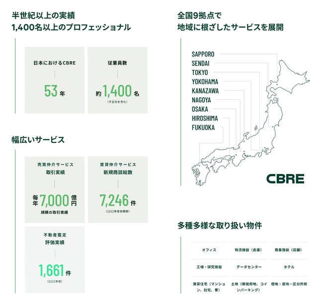 CBRE日本法人(シービーアールイー株式会社)は、不動産賃貸・売買仲介サービスにとどまらず、各種アドバイザリー機能やプロパティマネジメント、不動産鑑定評価などの17の幅広いサービスラインを全国規模で展開する法人向け不動産のトータル・ソリューション・プロバイダーです。CBREの前身となった生駒商事が1970年に設立されて以来、約半世紀以上にわたり、日本における不動産の専門家として、全国9拠点で地域に根ざしたサービスを展開してきました。企業にとって必要不可欠な「ビジネスインフラ」として認められる不動産アドバイザリー&サービス企業を目指して、国内約1,400名*のプロフェッショナル(*子会社を含む)が、最適かつ的確な不動産ソリューションを中立的な立場で提供いたします。詳細につきましては日本国内ホームページ www.cbre.co.jp をご覧ください。公式Twitterアカウント:@cbrejapan