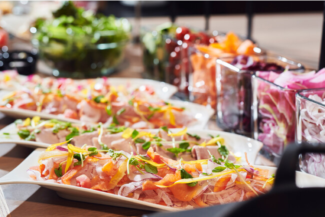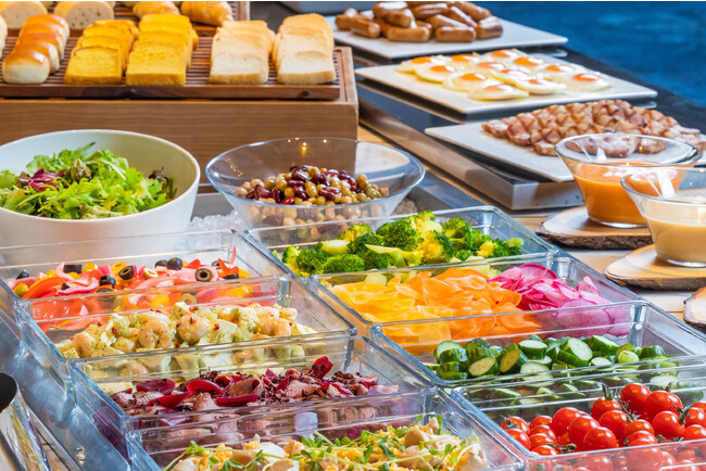 朝食ビュッフェでは、彩り豊かな野菜と鶏肉やローストビーフなどをお好きに組み合わせられるヘルシーなパワーサラダコーナーや、大阪のローカルフード「どて焼き」「牛肉と豆腐のお吸い物」、ライブクッキングでは焼き立ての「いか焼き」や「とん平焼き」を日替わりでご用意。朝の陽光感じる爽やかな空間でこだわりメニューをお楽しみください。