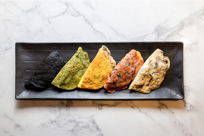 「ファイブ カラーズ イカ焼き」は、ご当地B級グルメ・イカ焼きを、さまざまな素材で色付けしました。イカスミを使用した“ブラック”、ビーツとレッドキャベツでほんのり色付けした“ピンク”、ほうれん草を加えた“グリーン”、卵の旨みを味わえる“イエロー”、イカ焼きの定番“ホワイト”の5つをご用意します。