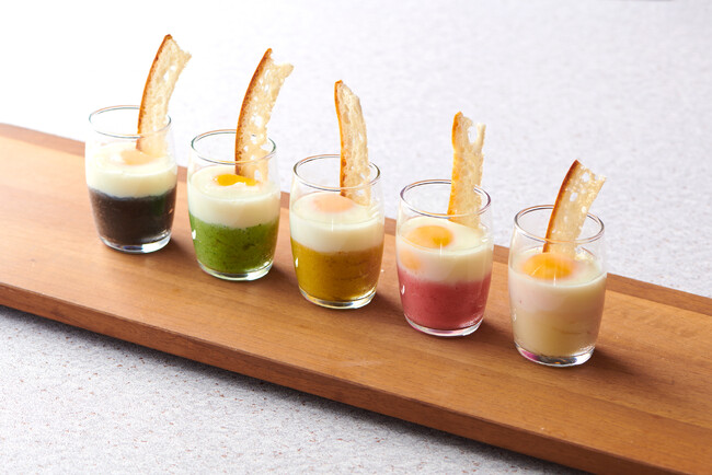北海道産のジャガイモをなめらかなマッシュポテトにし新冠産平飼い有精卵と一緒に蒸しあげた、朝食で人気のメニューをアレンジ。チーズやバジル、カレーなどとマッシュポテトを組み合わせて5つの風味と色を表現しました。カリカリのメルバトーストにたっぷりつけてお召し上がりください。