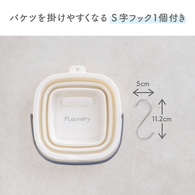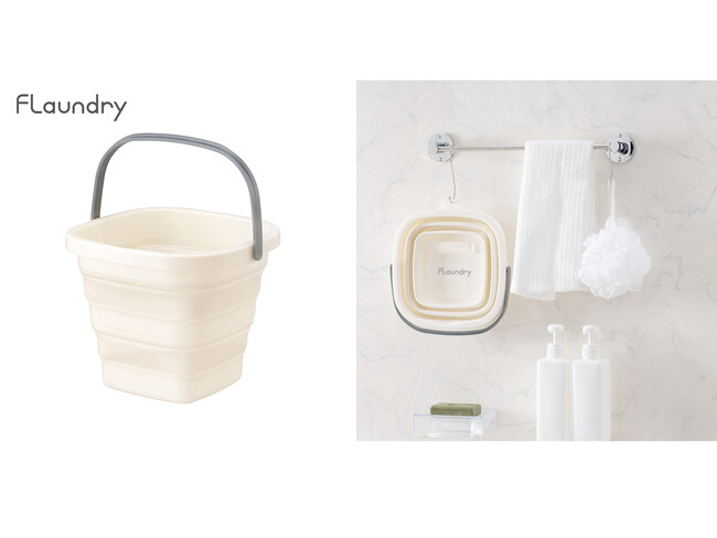 『フランドリー・たためる洗濯バケツ』は洗濯前の予洗いやつけ置き洗い、掃除などにも使用できるバケツで、使用後は折りたたんでコンパクトに収納ができます。本体にフック用の穴が開いており、付属のS字フックで吊るしての収納も可能です。上部に注ぎ口と底面に持ち手がついているので、排水しやすい仕様です。本品は、生活者の暮らしや環境にやさしい洗濯用品としてダイヤが提案する『フランドリー』シリーズの商品です。