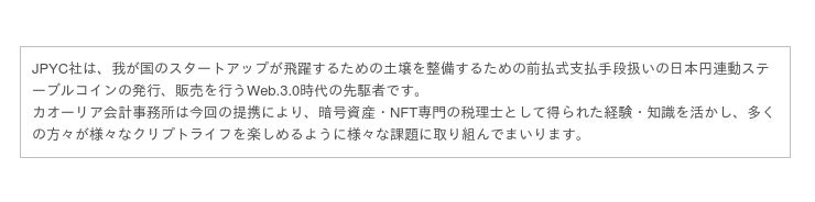 より多くの方々にJPYCをご利用いただくことを目指して、JPYCとの親和性が高い事業者との提携を積極的に行っております。カオーリア会計事務所は暗号資産・NFTの税務を専門とした税理士事務所です。最新の暗号資産・NFTの税法を熟知し、技術面においても多くの知見を備えています。日本円ステーブルコイン「JPYC」の税金に関するお問い合わせに幅広く対応できる体制の構築にむけたパートナーとしての相性が良いことから、業務提携するに至りました。