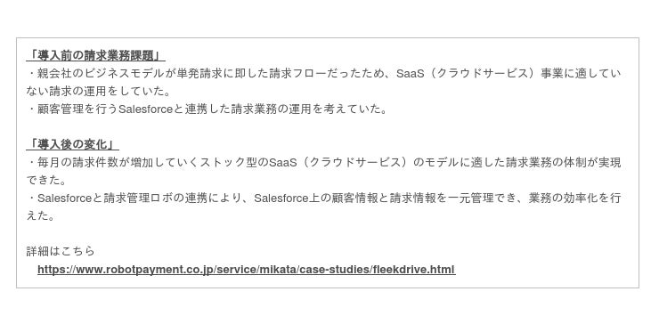 Fleekdriveはファイル共有サービス「Fleekdrive」、及び帳票サービス「Fleekform」というSaaS(クラウドサービス)を提供する会社になります。分社化によって発生した請求業務において、毎月の請求件数が増加していくストック型のSaaS(クラウドサービス)モデルに適した請求業務の運用を模索され、毎月の継続請求に強くSalesforceへの連携が実現可能な「請求管理ロボ for Saleforce」を採用いただきました。