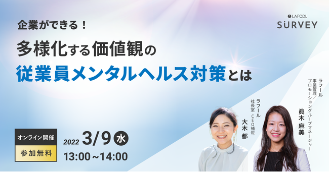 「個人が変われば、 組織が変わる」組織改善サーベイ『ラフールサーベイ』を提供する株式会社ラフール(本社:東京都中央区、代表取締役社長:結木啓太、代表取締役副社長:小梨明人、以下「ラフール」)は、『企業ができる!多様化する価値観の従業員メンタルヘルス対策とは』をテーマとしたオンラインセミナーを2022年3月9日(木)に開催します。
