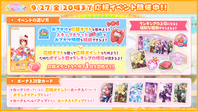 「おでかけ」で応援ギフトを集めて、メンバーへ贈ることで応援ポイントを入手できます。応援ポイントを獲得することでランキングに参加することができ、ランキング上位者には特別なデコアイテムやベリーなどの報酬が獲得できるイベントになっています。ランキングに参加した方全員にも報酬を用意しています。イベント開催に合わせて、カード&衣装ガチャやデコガチャ、キャンペーンチャレンジなど様々なコンテンツが追加されておりますので、是非ご参加ください。