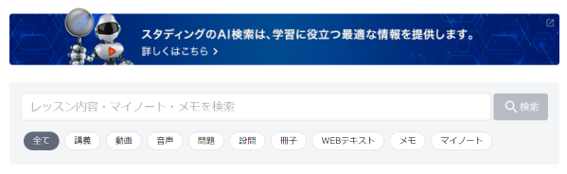 検索の対象は、動画講座、テキスト、練習問題、過去問などのスタディングの学習コンテンツはもちろん、質問に対する講師の回答(Q&Aサービス対象講座の場合)や、スタディングの学習プラットフォーム上で受講者自身が作成した「マイノート」や「メモ」についても横断的に検索できます。