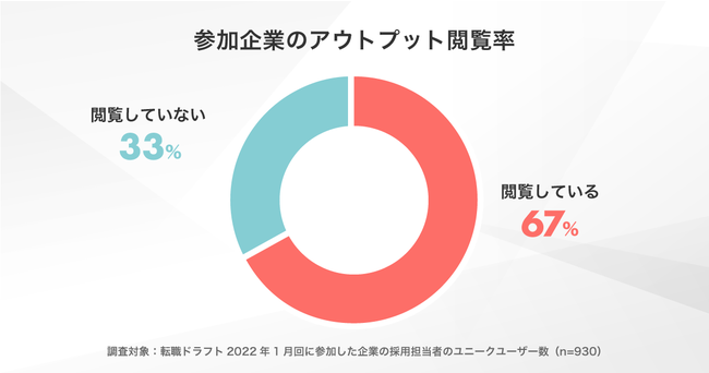 なお、アウトプットが転職ドラフト参加企業にどの程度注目されているかについて調査したところ、参加企業の採用担当者930名のうち67%が候補者のアウトプットを閲覧していました。