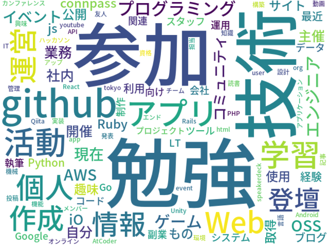 次ぐ「活動」「運営」「登壇」「OSS」「コミュニティ」「イベント」などのキーワードからは、例えばネイティブアプリの個人開発、特定の技術スタックやキャリアについてのイベント主催や運営、OSS活動へのコミット、書籍やテックブログの執筆など、多様な課外活動に取り組んでいることがうかがえます。