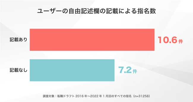 取り組みの成果は数字に表れており、転職ドラフトを開催した2016年から2022年1月回までの全ての指名を調査したところ、アウトプット記入欄すべてに記載がある方はドラフト参加1回あたりの指名数(以下、UU指名数)が平均10.6件であるのに対し、自由記述欄に記載がない方のUU指名数は平均7.2件。アウトプットの自由記述欄を活用して、積極的に自身の技術力や取り組みについて記載したかどうかで、UU指名数に3.4件の差が見られました。