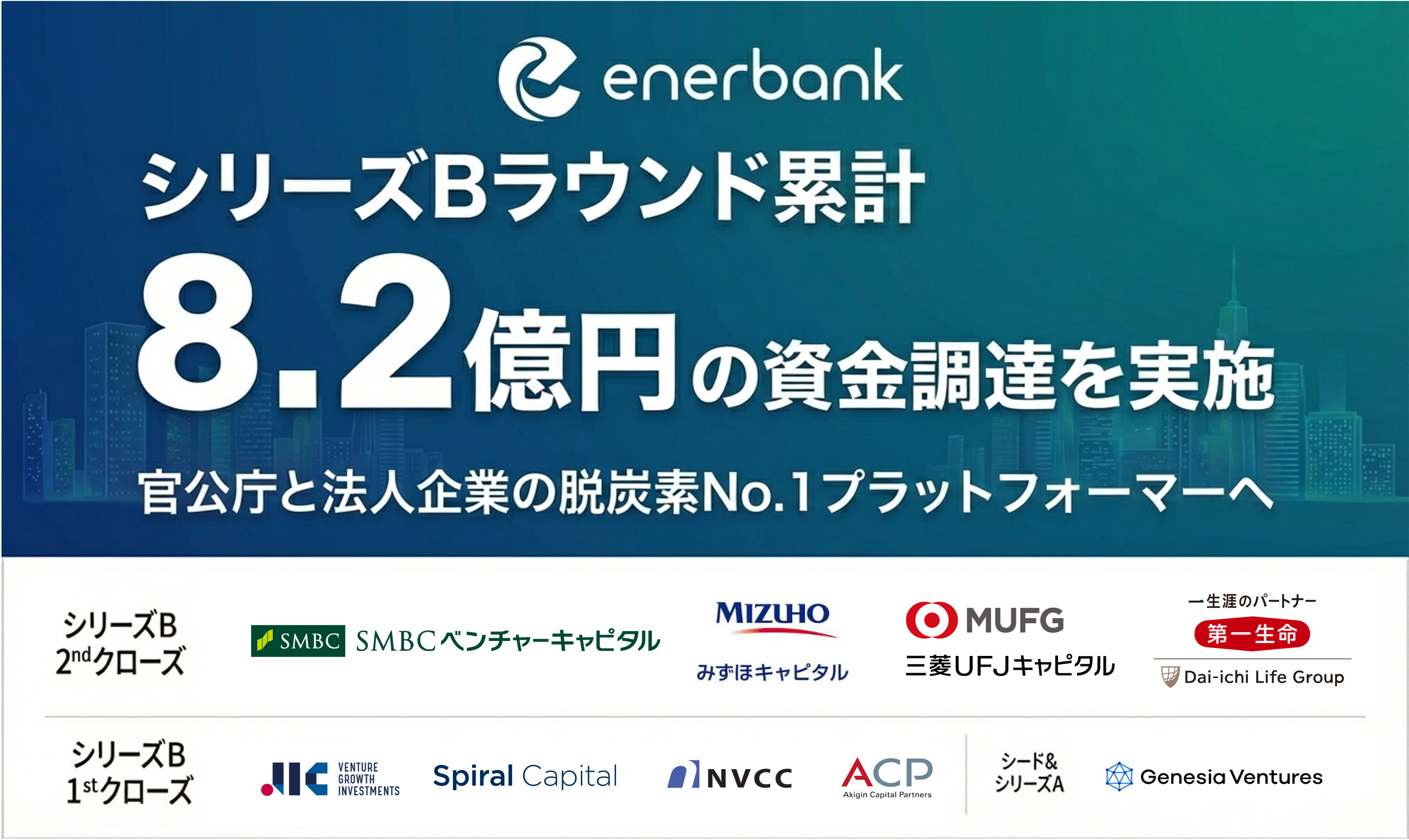 再生可能エネルギー・脱炭素領域のエネルギーテック企業である株式会社エナーバンク(本社:東京都中央区、代表取締役:村中健一、佐藤丞吾、以下「エナーバンク」)は、シリーズBラウンドにおいて新たにSMBCベンチャーキャピタル株式会社、みずほキャピタル株式会社、三菱UFJキャピタル株式会社、第一生命保険株式会社を引受先とした第三者割当増資を実施しました。これにより、ファーストクローズ時の5.8億円と合わせ、シリーズBラウンド累計で8.2億円の資金調達を完了しましたのでお知らせいたします。