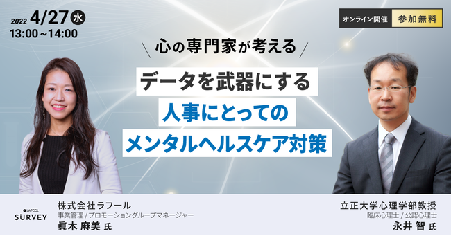 「個人が変われば、 組織が変わる」組織改善サーベイ『ラフールサーベイ』を提供するメンタルデータテックの株式会社ラフール(本社:東京都中央区、代表取締役社長:結木啓太、代表取締役副社長:小梨明人、以下「ラフール」)は、立正大学心理学部教授永井氏をお招きし、『心の専門家が考えるデータを武器にする人事にとってのメンタルヘルスケア対策』をテーマとしたセミナーを2021年4月27(水)に開催します。