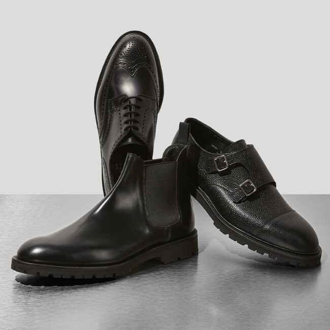 熟練したクラフツマンシップに支えられ、普遍的な美しさを誇るイギリス発のシューズブランド<クロケット & ジョーンズ>。バーニーズ ニューヨーク100周年を記念して、3アイテムの“BLACK EDITION(ブラックエディション)”をオーダーしました。伝統的なフルブローグのダービーシューズをアップデートした“PEMBROKE 2(ペンブローク 2)”、グレインレザーを採用したダブルモンクストラップの“TAY(テイ)”、トゥ周りにボリュームを持たせモードに仕上げた“CHELSEA5(チェルシー5)”の3モデルをご用意。どのモデルもかっちりした見た目に反し、スニーカーのように気軽に履けて日常に寄り添います。