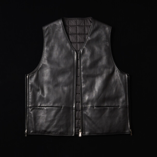 スタンダードなアイテムにコンテンポラリーな要素を加えたユニセックスなウェアを展開する<ヨーク>には、トレンド感のあるベストをブランドでも定評のあるレザーでオーダー。<ヨーク>らしいハードな質感のシープレザーを表面に、裏側には中綿入りのキルト素材を用い、リバーシブル仕様にすることで、保温性だけでなく着まわししやすい一着に仕上げました。軽い羽織りやレイヤリングアイテムとして、これからの季節のコーディネートを格上げするアイテムとしておすすめです。