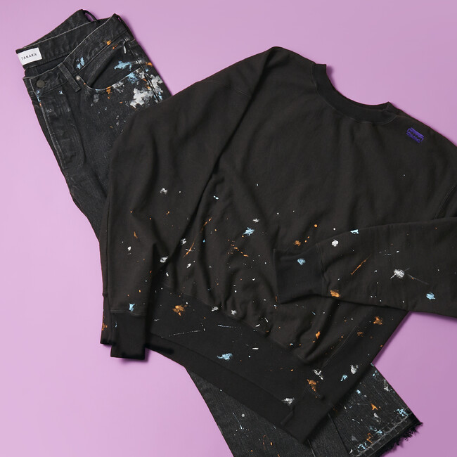 デザインとサスティナビリティを追求し、“これまでの100年とこれからの100年を紡ぐ服”をコンセプトに掲げる<タナカ>には、得意のクラフトワークを駆使し、一点ずつ職人が手作業でペイントをほどこしたスエットシャツとデニムパンツを限定アイテムとしてオーダーしました。ポケット付近の作業跡やひざ下から裾にかけて飛んだペンキなど、ストーリー性を感じる加工感に唯一無二のこだわりが詰まっています。