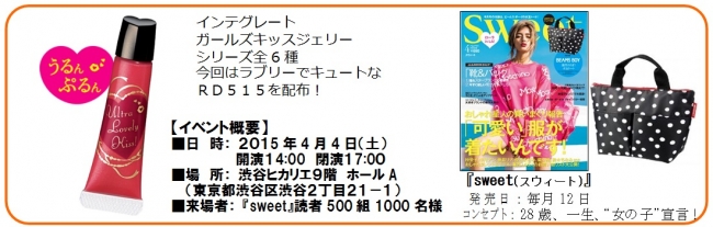 ファッション雑誌販売部数トップシェア※の株式会社宝島社(代表取締役社長:蓮見清一 本社:東京都千代田区)は、女性ファッション雑誌『sweet(スウィート)』の読者イベント「スウィート コレクション2015」(日時:2015年4月4日、場所:渋谷ヒカリエ)で、メーキャップブランド「インテグレート」とコラボレーションし、イベント参加読者1000人にリップグロスをサンプリングしました。