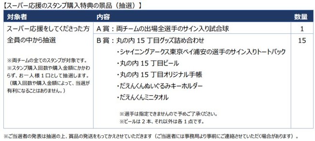 スポーツ応援観戦アプリ「SpoLive」にて、本試合の”スーパー応援(投げ銭)”にて集まった金額の一部が、deleteC を通じてがん治療研究へ寄付されます。 また、スーパー応援のスタンプ購入特典として、両チームの出場全選手のサイン入り試合球や丸の内 15 丁目グッズ詰め 合わせなど豪華景品が当たる抽選も実施いたします。