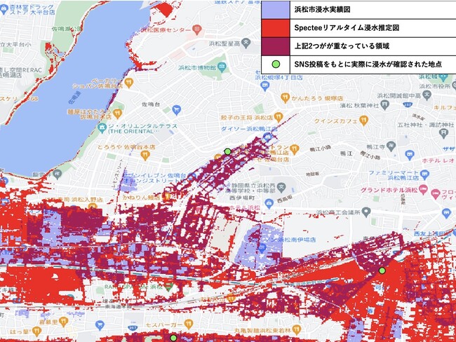 防災テックベンチャーの株式会社Spectee(東京都千代田区、代表取締役:村上建治郎、以下スペクティ)は、浜松市と共同で、スペクティのAI技術を活用した水害の被害状況把握を迅速化する実証実験を行いました。本実証実験で得られた成果をもとに、スペクティでは『リアルタイム浸水推定図』のサービス精度を高め、自治体の災害復興対応に貢献していきます。