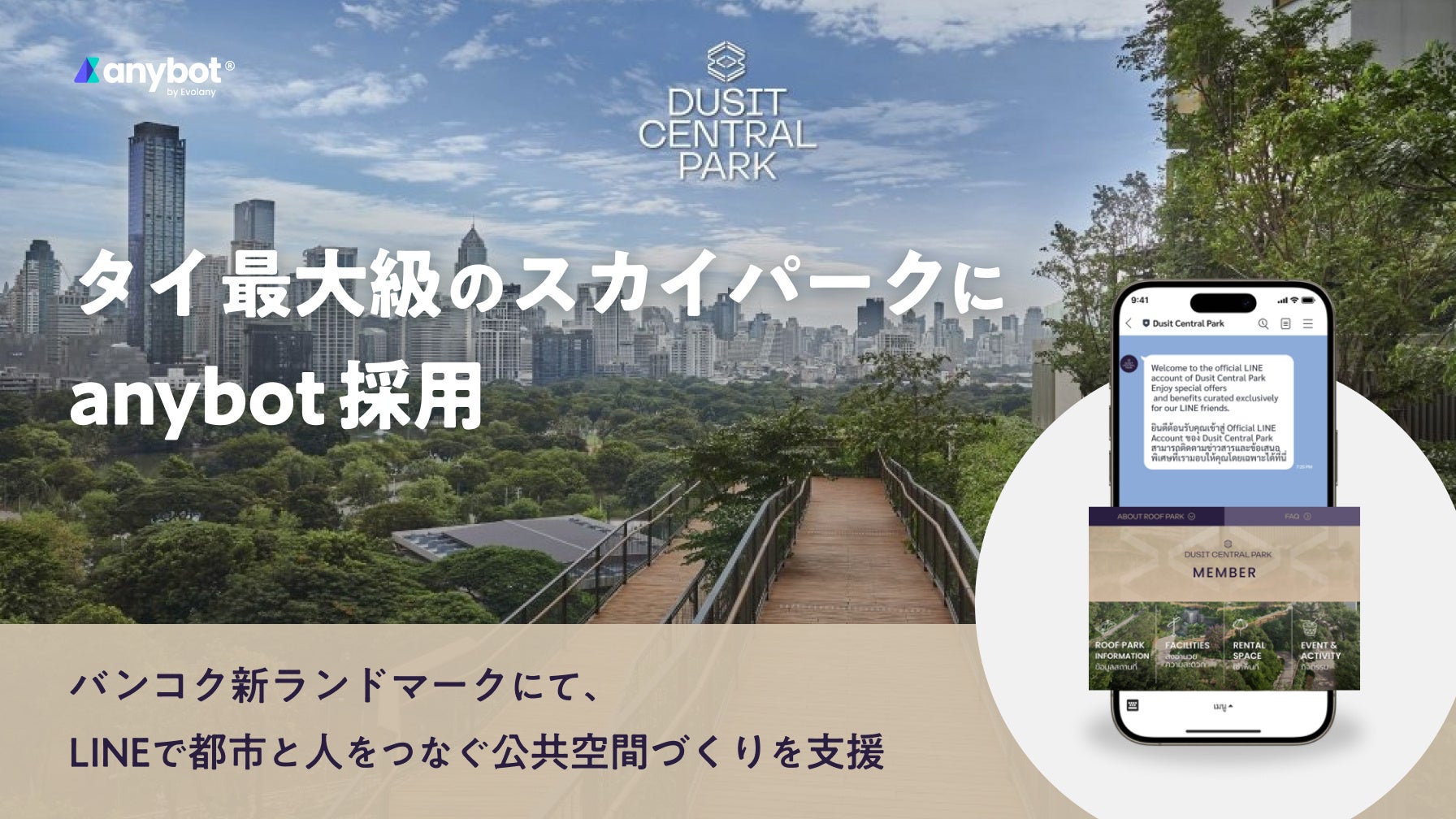 エボラニ株式会社(本社:神奈川県横浜市、代表取締役:宋 瑜)が提供するLINEミニアプリ・チャットボット開発ツール「anybot」が、タイ・バンコク中心部に誕生した都市型公園「Dusit Arun at Dusit Central Park」に採用されました。本取り組みは、誰もが安心して集える交流拠点を育て、繰り返し訪れたくなる公共空間づくりを支えることを目的としています。来園者はスマートフォンを通じて情報やサービスにアクセスでき、イベントや施設をより便利に利用できます。