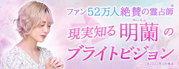 占い動画配信サイトの先駆者として絶大な人気を誇る明蘭。幼少期からの占いへの傾倒と霊感による鑑定があなたの元に。イメージや言葉で現実を映すブライトビジョンで、今進むべき道を示します。