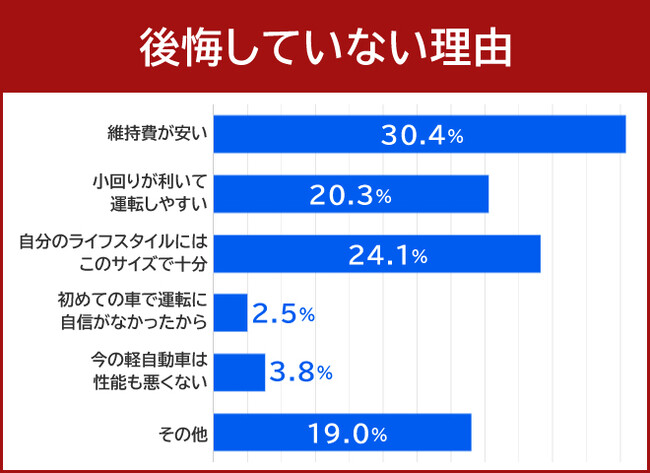軽自動車を選んで後悔していないと答えた人にその理由を質問したところ、30.4%の方が「維持費が安い」と回答しました。