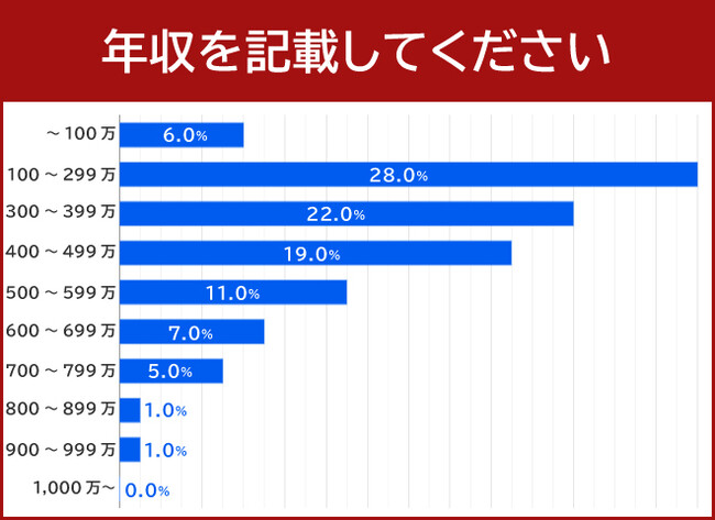 年収について質問したところ、28.0%の方が「年収100万円〜299万円」と回答しました。比較的若い世代が多いことから、高めの年収の方は少ない印象となっています。