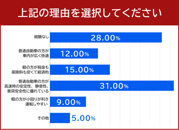 3位は「普通自動車の方が車内が広く快適」と12.0%でした。普通自動車は軽自動車よりも大きな車体で、車内が広々としていることから、乗り心地がよいという声がありました。