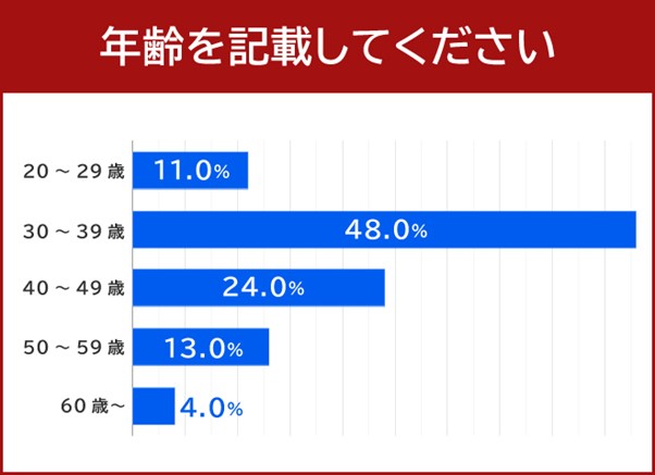 年齢についての質問では、48.0%の方が「30〜39歳」と回答し、30代の人が約半数となっています。次に40代の方が多く24.0%を占めており、30〜49歳の方で約7割を占める結果となりました。