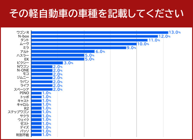 軽自動車の車種について質問すると、13.0%の方が「ワゴンR」と回答しました。ワゴンRは1993年にスズキから発売され5度のフルモデルチェンジを経て、現在は6代目のワゴンRが販売されています。