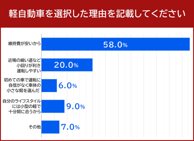 軽自動車を選択した理由について質問をすると、58.0%の方が「維持費が安いから」と回答しました。