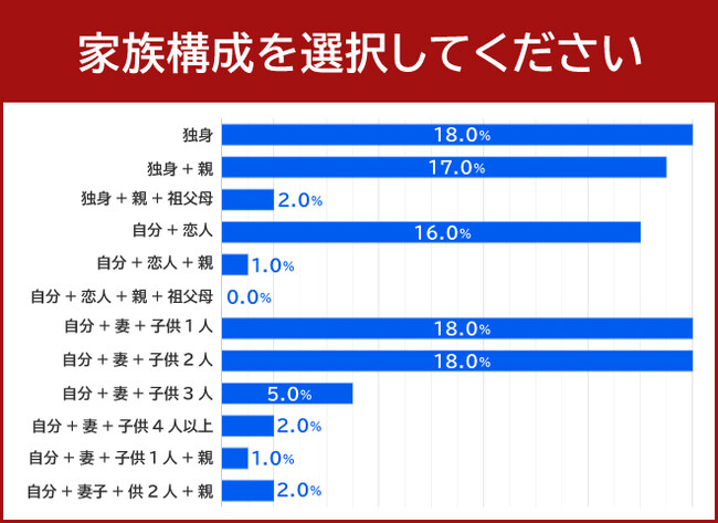 家族構成について質問したところ、18.0%の方が独身、自分+妻+子供1人または2人と回答しました。