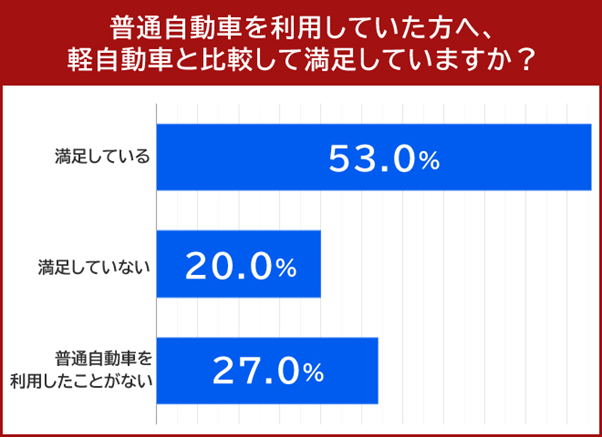 過去に普通自動車を利用していた人に軽自動車に満足しているか質問すると、53.0%の方が「満足している」と回答しました。