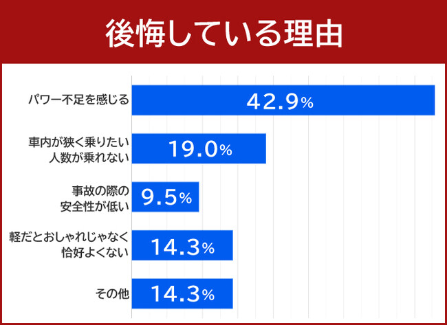 軽自動車を選んで後悔している人に理由について質問すると、42.9%の方が「パワー不足を感じる」と回答しました。