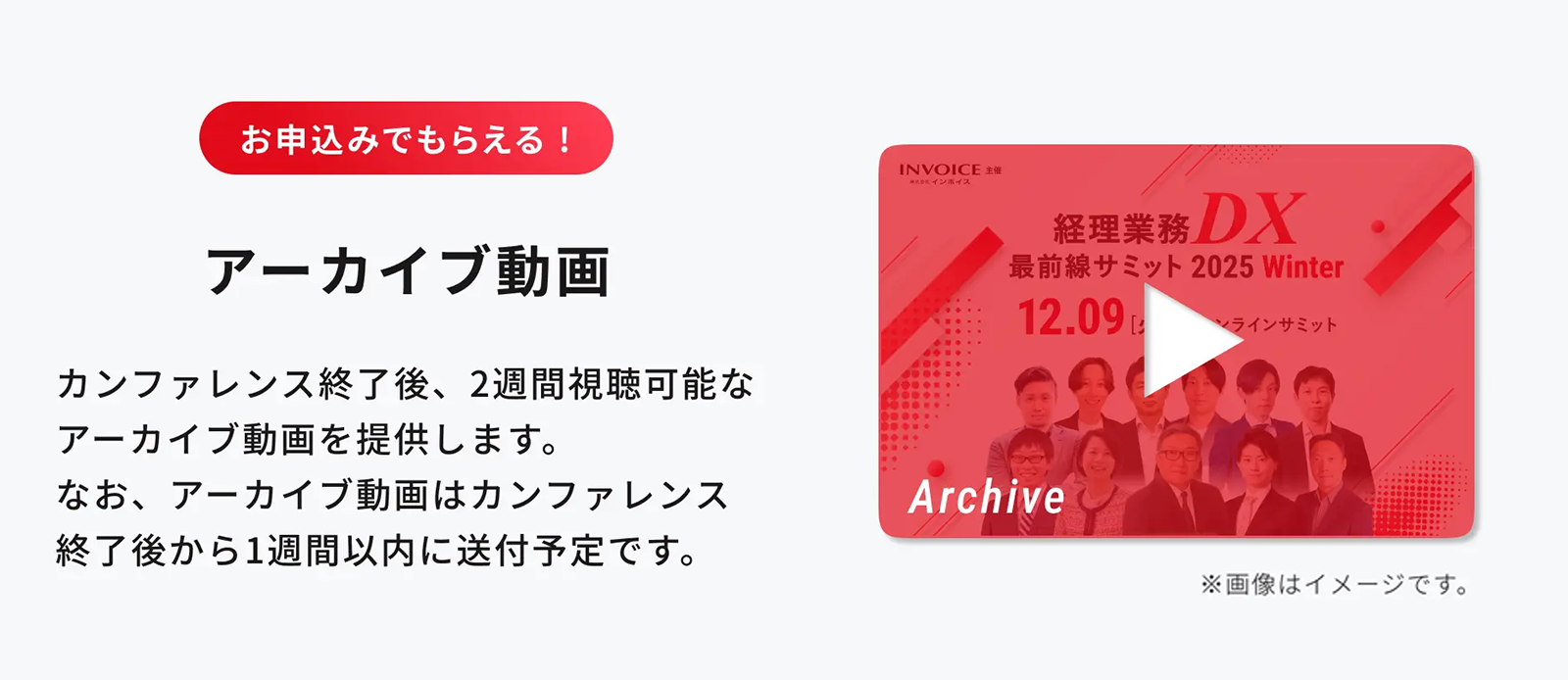 また、本カンファレンスに申込みいただいた方には2週間視聴可能なカンファレンスのアーカイブ動画をお申込み特典として配布しています。動画の送付はカンファレンス終了後から1週間以内に送付いたします。