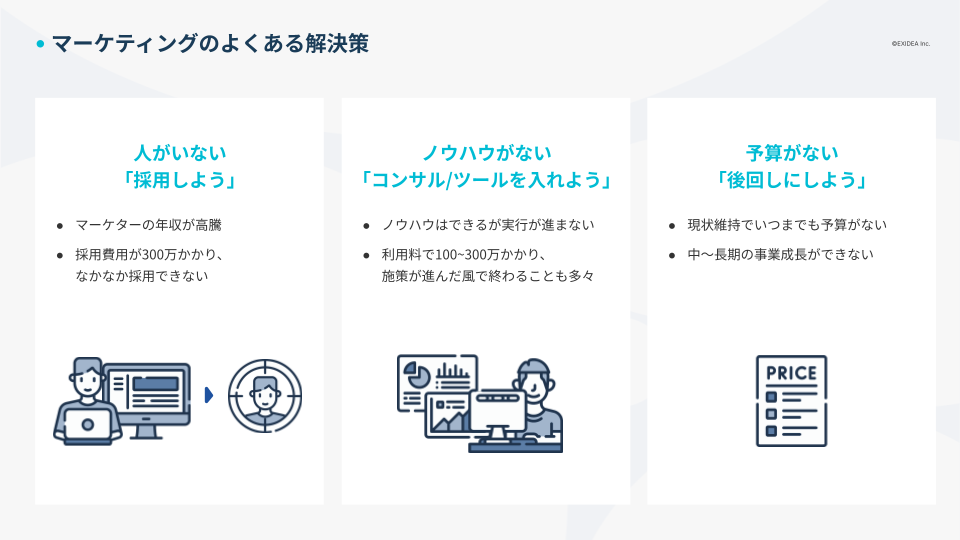 本サービスでは、企業さまのマーケティング活動における「人がいない」「ノウハウがない」「予算がない」という課題に対し、当社の専門チームが代行することで、”競合に打ち勝つための鍵”となるようご支援いたします。