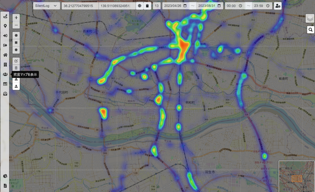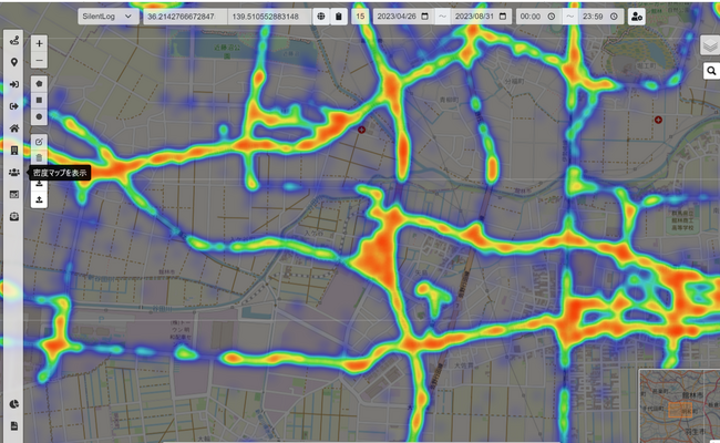 なお、ヒートマップから個人を特定できないように、滞在者が少ない地点は、ヒートマップから除外している。従って、地図上にヒートマップの色が描画されていない地点は、滞在者が全く存在しない、または、滞在者が少ないために無視された地点に該当する。