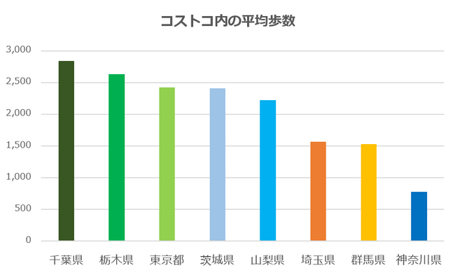 コストコ内での平均歩数は、千葉(2846歩)、栃木(2635歩)、東京(2422歩)であり、群馬は7位(1528歩)であった。