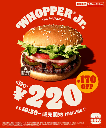 バーガーキング(R) 自慢の直火焼きの100%ビーフパティを使用した人気商品『ワッパー(R) ジュニア』を、通常価格より43%オフ170円引きの特別価格220円で販売するキャンペーンを1週間限定で開催いたします。朝10時30分から夜までの終日、お得にバーガーキング(R) の本格バーガーをお楽しみいただけます。
