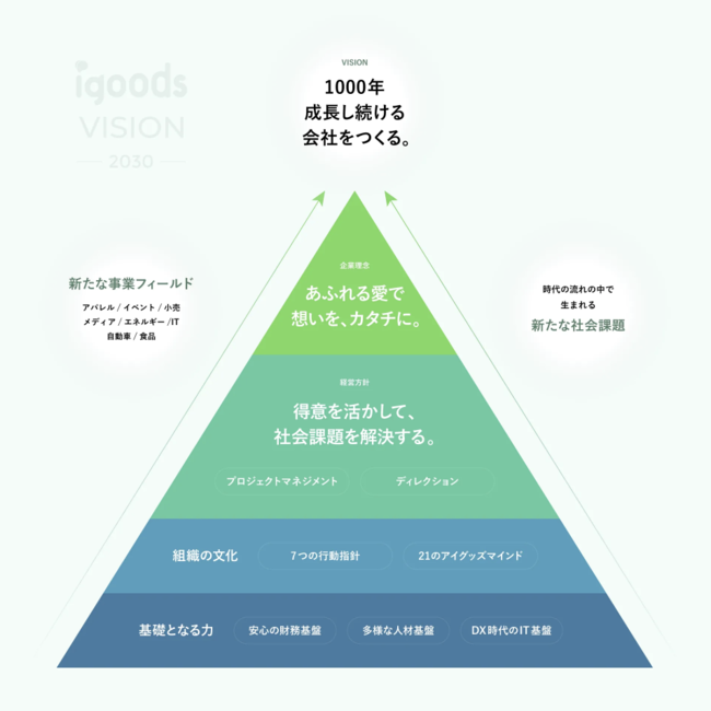 時代の変化と共に、社会では次々に新たな課題が生まれています。アイグッズはその流れをいち早く察知し、得意を介して新たな領域にチャレンジしていくことで、社会により大きな貢献を果たし、自らも成長させていきます。私たちはその志を体現するために、経営計画「igoods VISION 2030」を打ち立てました。