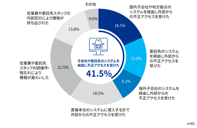 過去1年間に発生したサイバー攻撃の侵入経路については、子会社や委託先のシステムを経由した攻撃が41.5%を占め、本社のシステムへの直接的な攻撃の約2倍となっており、サプライチェーン全体でのセキュリティの強化が不可欠であることが明らかになりました。